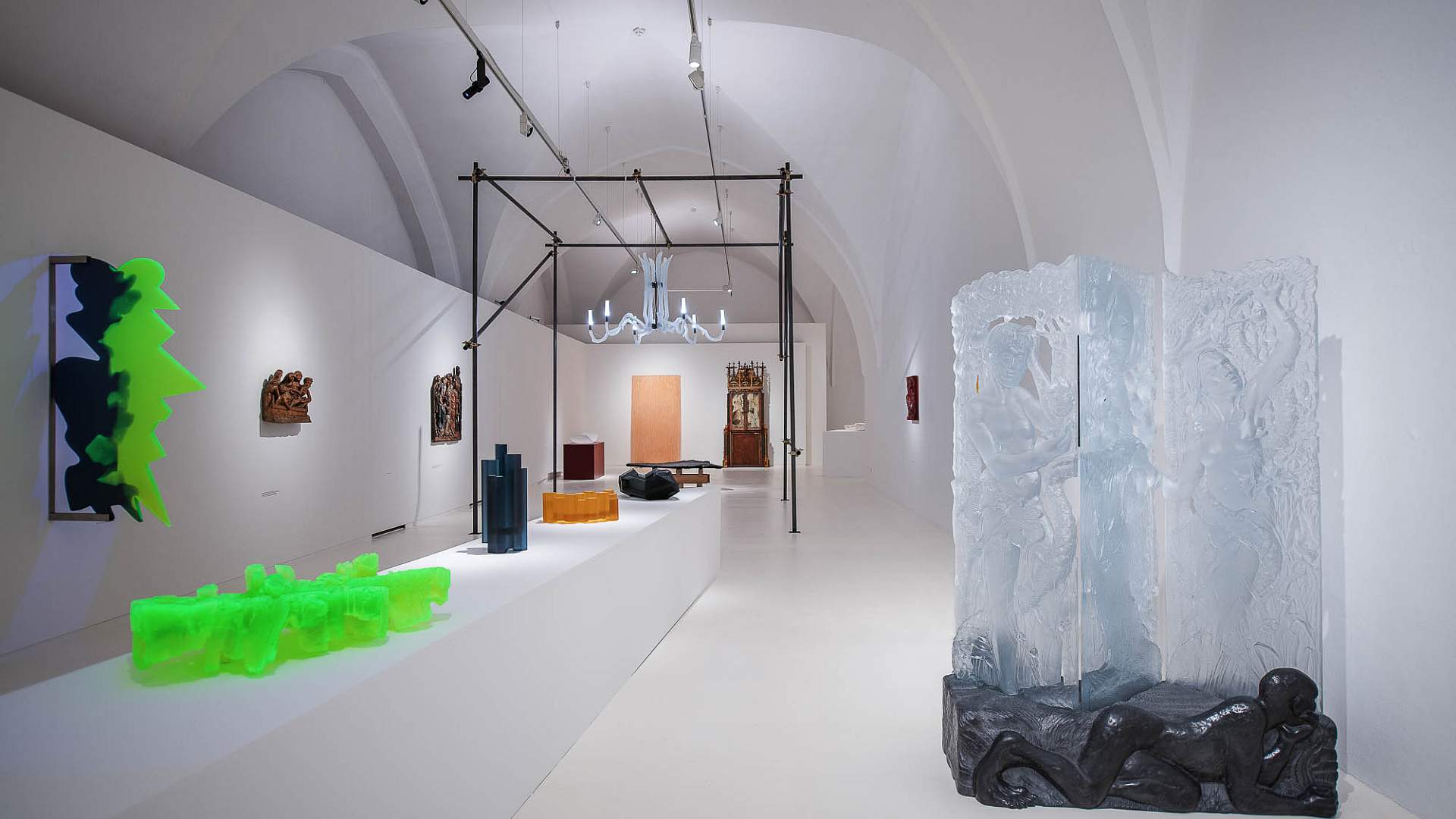 Současná sklářská díla autorů SIN Studio Gallery (mj. Arik Levy, Krištof Kintera, Milan Knížák, Richard Štipl, Rony Plesl) vytvořená unikátní technologií Vitrum Vivum vstupují do promyšleného dialogu se středověkými díly ze sbírek AJG, na nichž se dochovaly fragmenty skleněných aplikací.